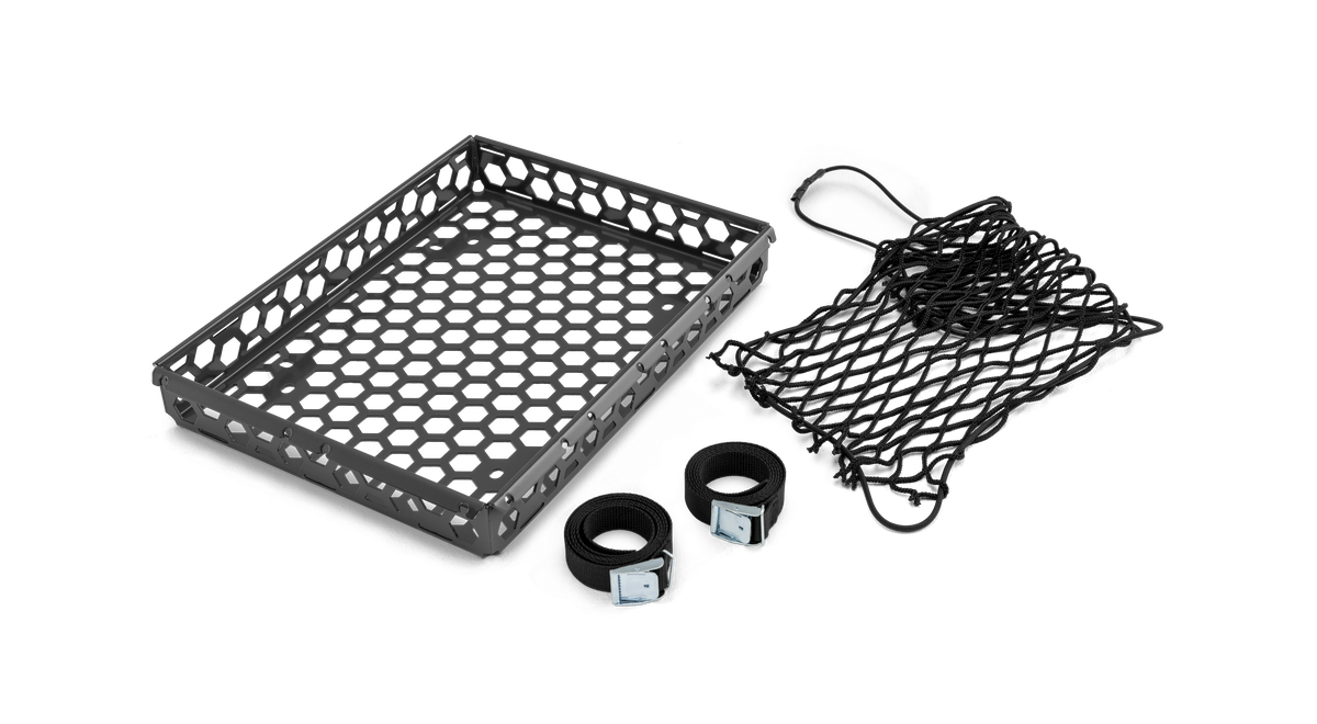 Praktisk lasthållare för extrautrustning. Enkel åtkomst till 12V uttag för laddning av bärbara batteriprodukter. Skenor och fästkrokar monteras som standard på motorhuven och kan kompletteras med en praktisk bagagehållarsats.